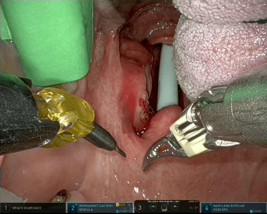 The patient underwent a single stage transoral robotic (TORS) Radical Tonsillectomy (lateral oropharyngectomy) along with left neck dissection.