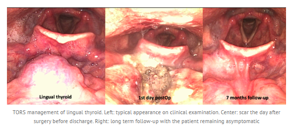 Transoral Robotic Surgery (TORS) has revolutionized minimally invasive surgical management of oropharyngeal lesions, including those at the base of the tongue. TORS for lingual thyroid excision is an efficient technique performed in a safe anatomical region (midline). The procedure benefits from 3D endoscopic vision and articulated instruments with robotic telemanipulation, enhancing precision. Emphasis must be placed on ensuring safety during the procedure, particularly concerning hemostasis, as postoperative bleeding from the base of the tongue can be perilous. However, the likelihood of severe complications with this technique remains very low. Typically, patients are observed overnight, resume oral intake the next day, and are discharged thereafter.