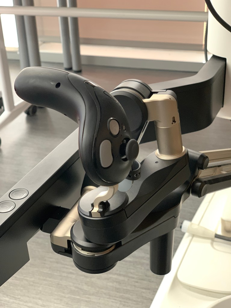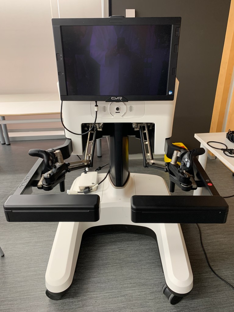 The surgeon’s console exhibits two notable differences compared to the previous design. Firstly, the visual system has transitioned from a visor to a monitor. Secondly, the absence of pedals is apparent.